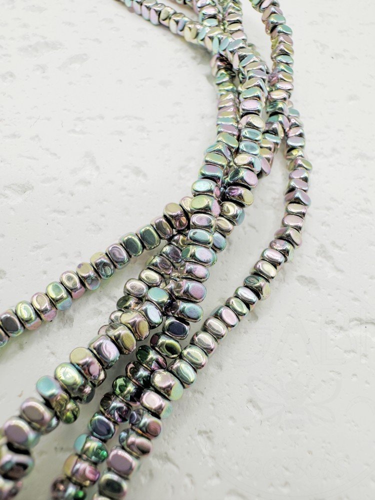 Hematitas, 3x3x1.7~2mm, sidabro spalvos su violetiniu/žaliu atspalviu, 40cm juosta
