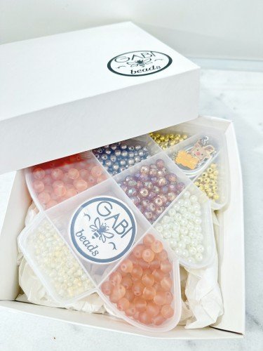 Rinkinį sudaro: Stiklo karoliukai, biserio karoliukai, metaliniai intarpai, pakabukai, virvelės su uždsegimu pakabukams, silikoninė guma apyrankėms verti, plastikinė dėžutė.