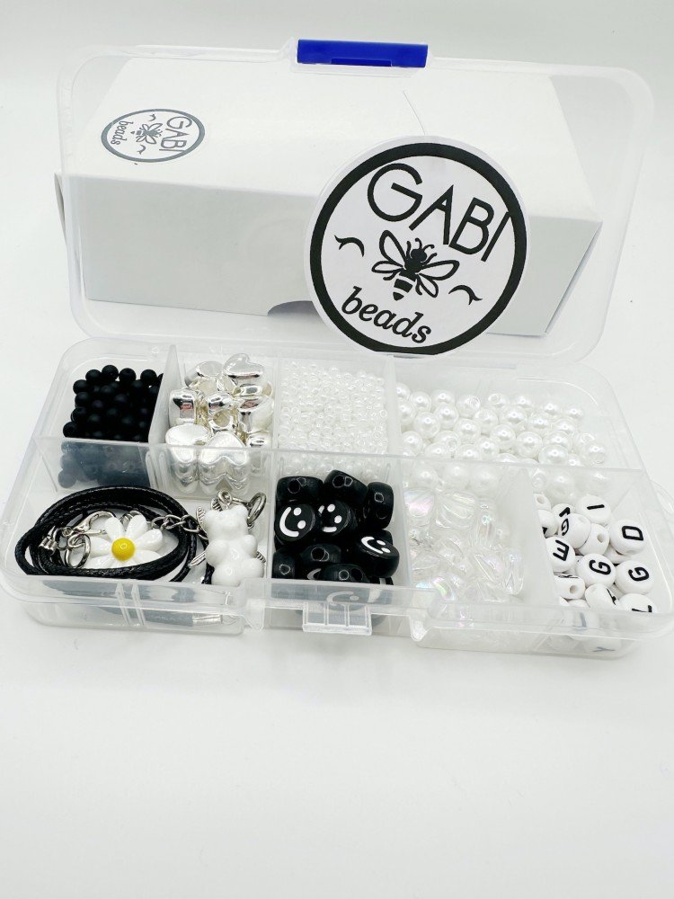 Rinkinį sudaro: onikso akmens karoliukai, stiklo perlų karoliukai, biserio karoliukai, plastikiniai karoliukai, pakabukai, virvelė su užsegimu, silikoninė guma apyrankėms verti, plastikinė dėžutė.