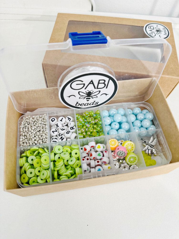 Rinkinį sudaro: Polimeriniai karoliukai, biserio karoliukai, plastikiniai karoliukai, stiklo karoliukai, metaliai intarpai, pakabukai, silikoninė guma apyrankėms verti, plastikinė dėžutė.