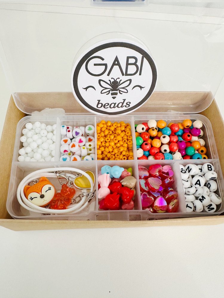 Rinkinį sudaro: biserio karoliukai, plastikiniai karoliukai, Onikso ir Hovlito akmens karoliukai, pakabukai, virvelė, silikoninė guma apyrankėms verti, plastikinė dėžutė, dirželis.