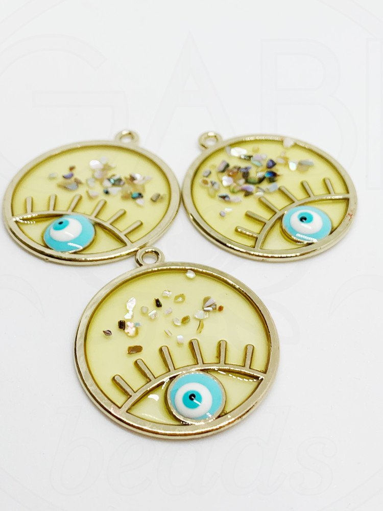 Plastikinis pakabukas "Akis", 35x39x4mm, aukso, gelsvos, žydros spalvos, 1vnt