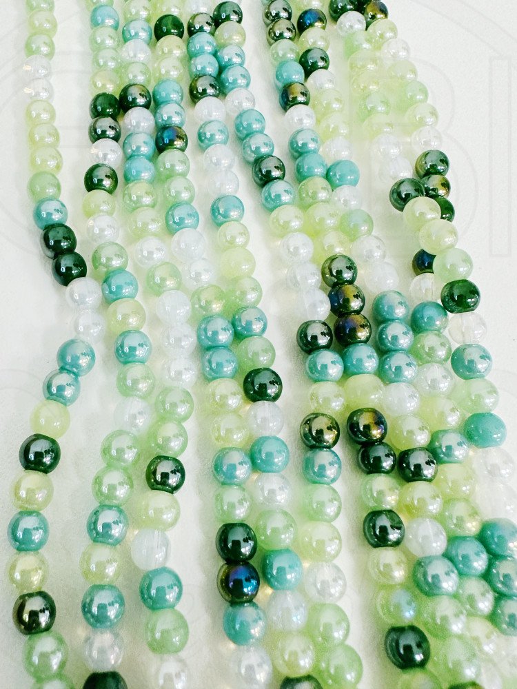 Stiklo karoliukai, baltos/žalios/melsvos spalvos , 4mm 37cm juosta