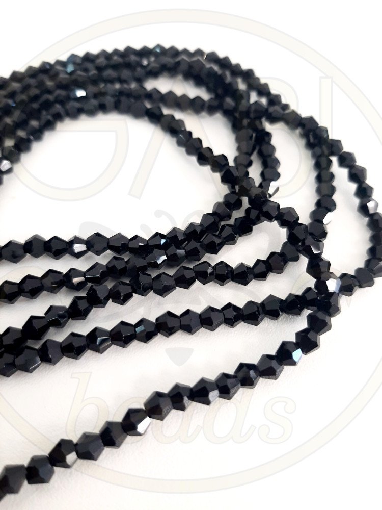 Stiklo kristalai, briaunuoti, rondelės forma Spalva: juoda, matinė 2x1mm - 30cm 6x4mm - 44cm 8x6mm - 44cm 10x8mm - 28cm 12x9mm - 30cm...