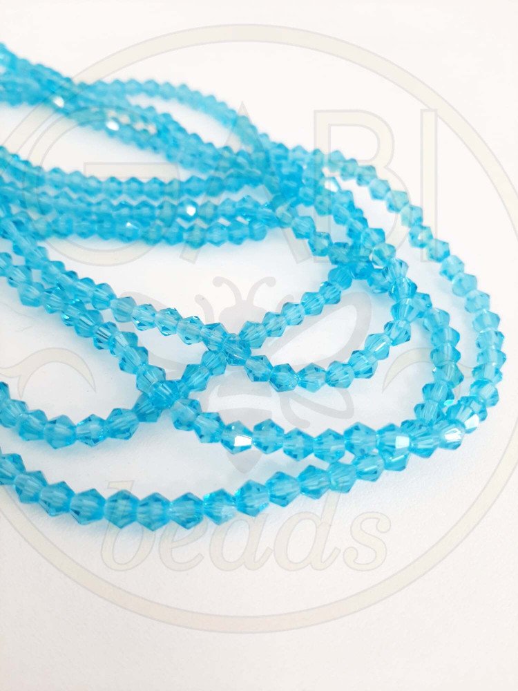 Stiklo kristalai, bicone forma, žydros spalvos, 4x4mm 35cm juosta