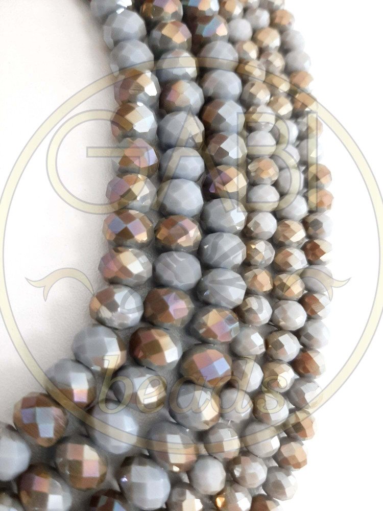 Stiklo kristalai, briaunuoti, rondelės forma, pilkos ir auksinės spalvos, 6x4mm, 8x6mm