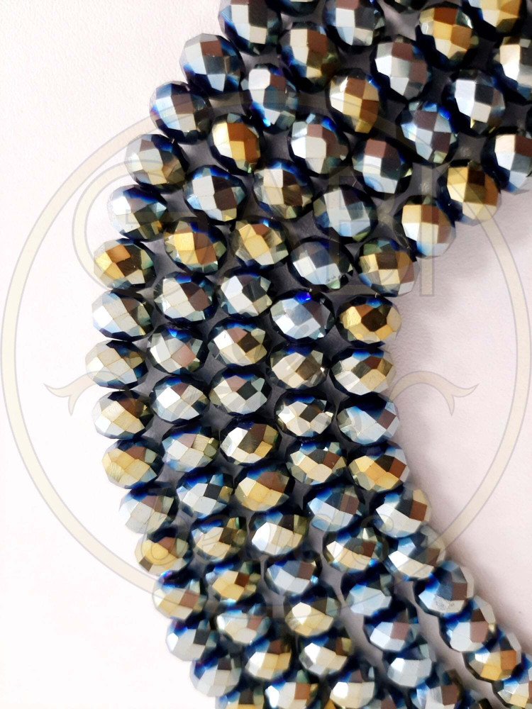 Stiklo kristalai, briaunuoti, rondelės forma, žalios, melsvos spalvos, 2x1mm, 3x2mm, 4x3mm, 8x6mm