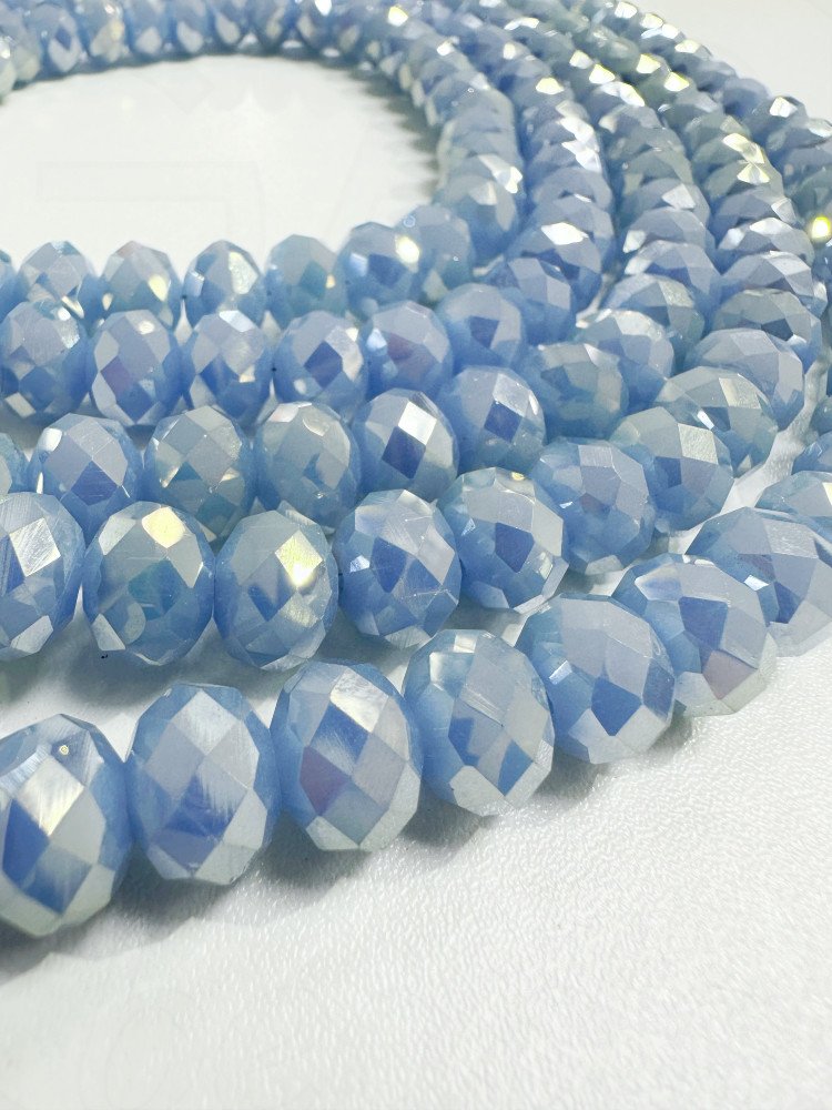 Stiklo kristalai, briaunuoti, rondelės forma Spalva: mėlyna 4x3mm - 44cm 6x4mm - 42cm 8x6mm - 40cm Prekės spalva realybėje ir nuotraukoje...